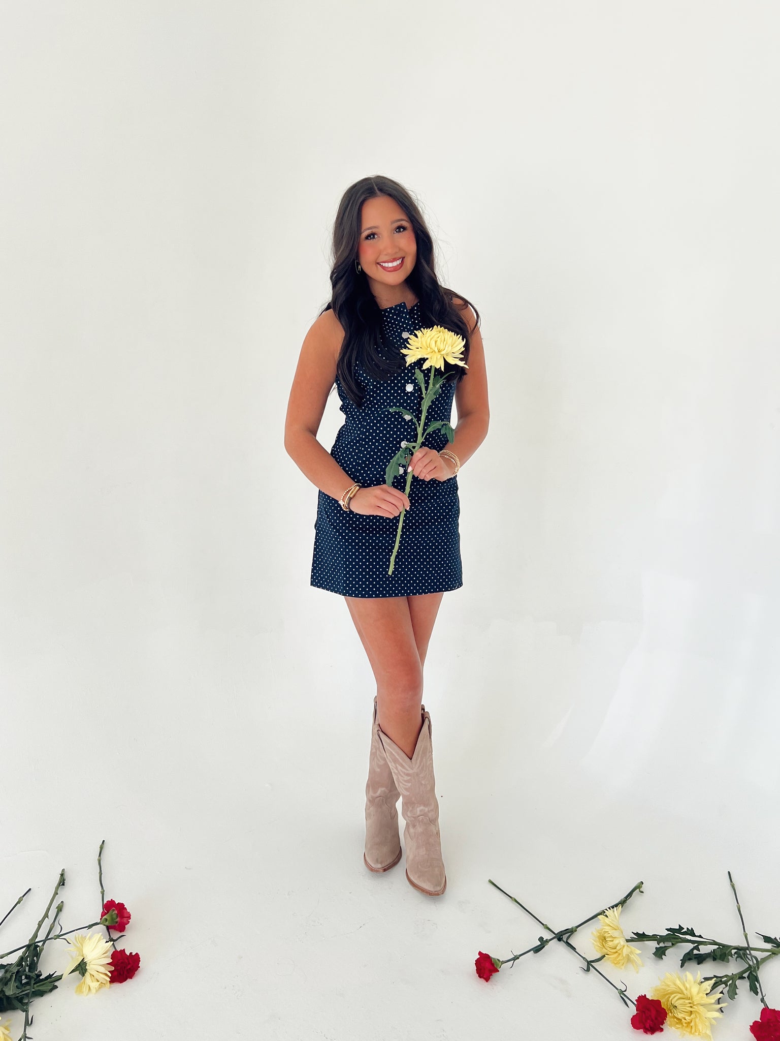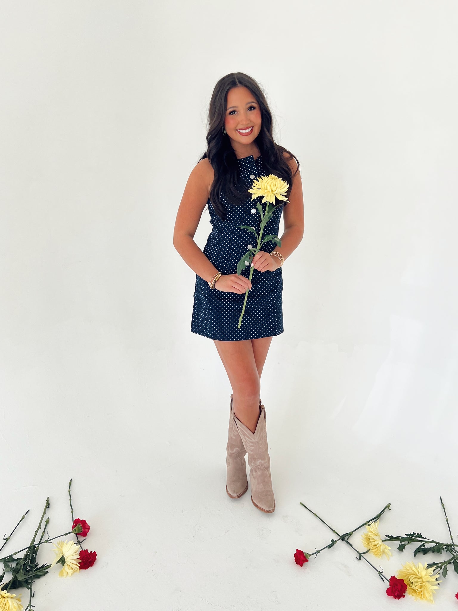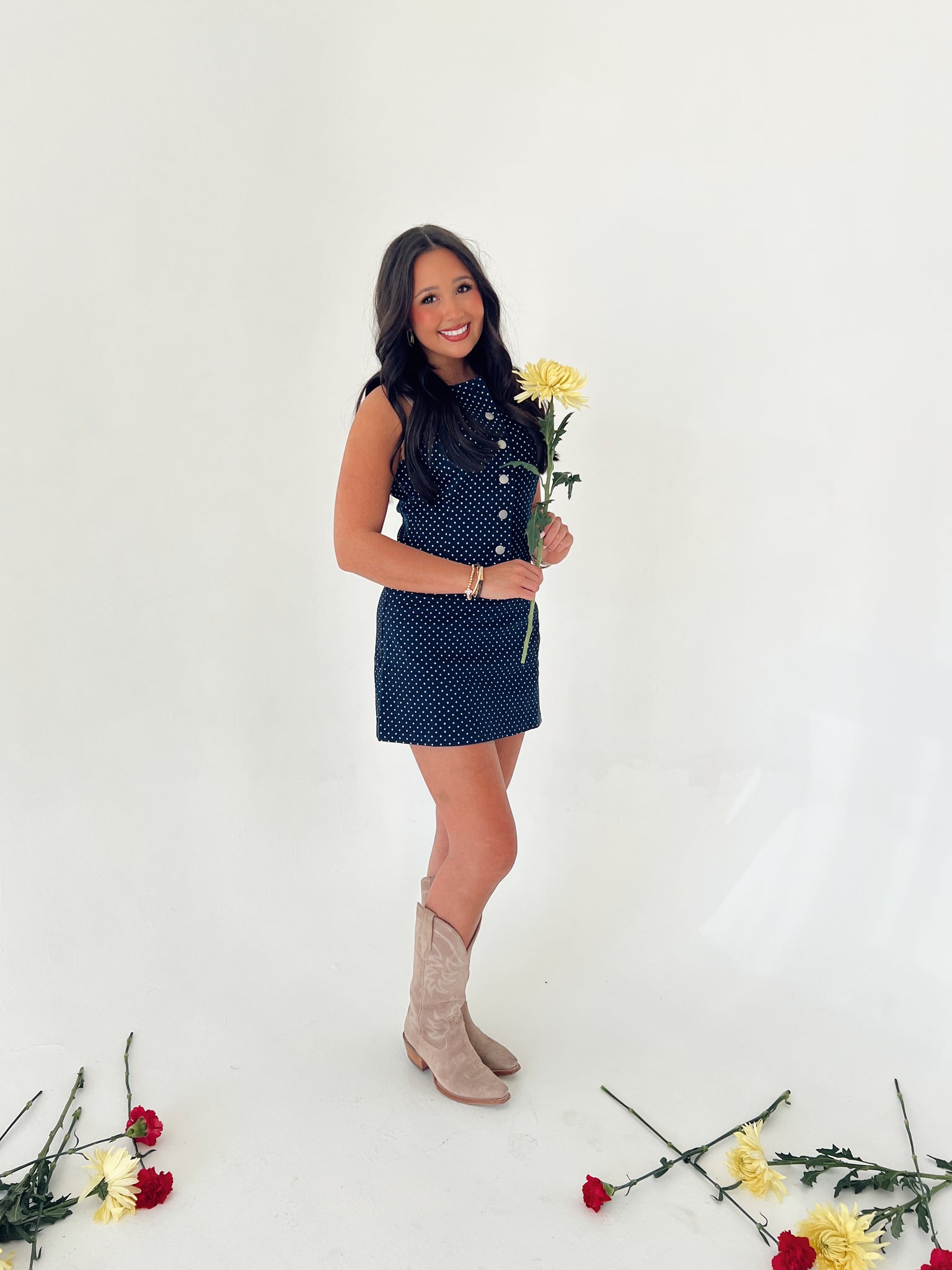 Introducing the Denim Polka Dot Mini Dress—your new spring and summer essential. This adorable denim dress features a classic drop waist silhouette with a button-down front, perfect for effortless styling from casual outings to weekend adventures. The minimal stretch fabric offers a structured fit that flatters all body types. If you're between sizes, we recommend sizing up for the perfect fit. Rylee is pictured wearing a size large.