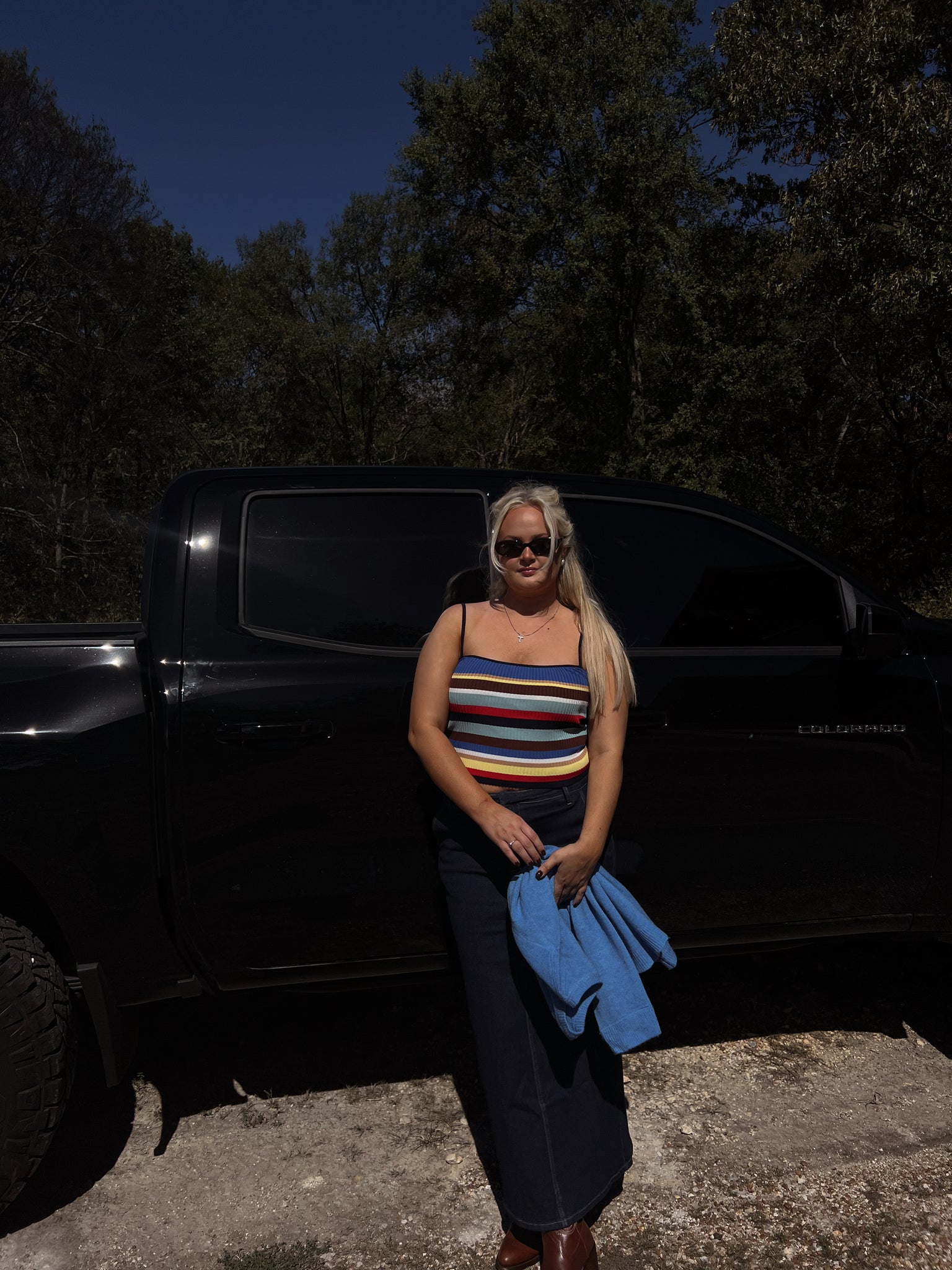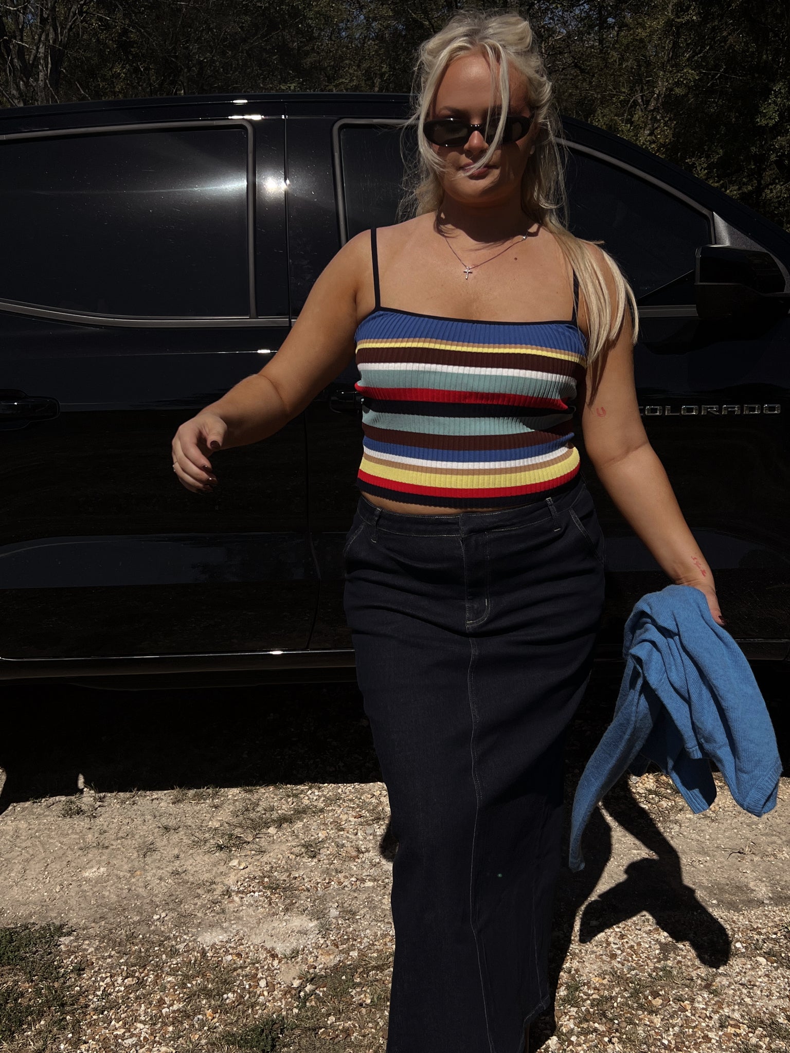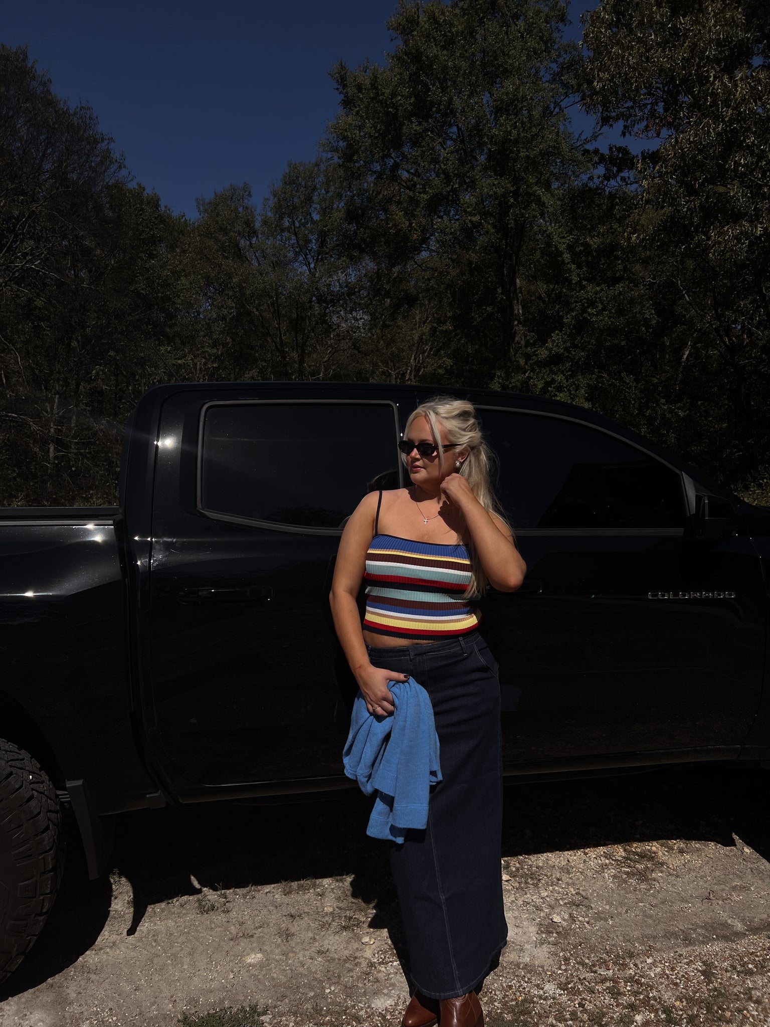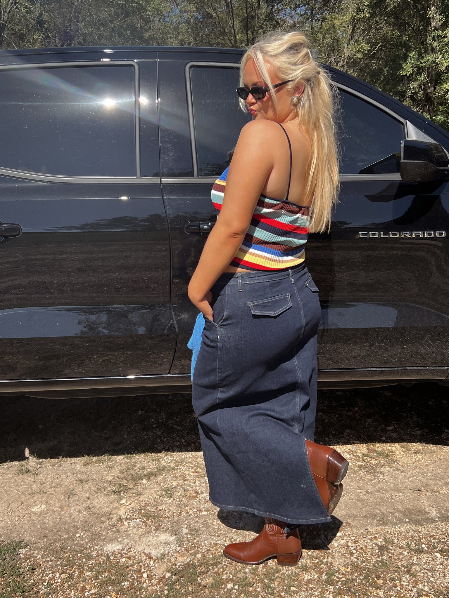 This super cute high-rise denim maxi skirt combines style and comfort effortlessly. Made with a stretch fabric, it offers ease of movement, highlighted by a subtle slit at the back. Its dark denim shade is perfectly on trend for fall and winter, making it an ideal go-to piece for the season. True to size, this skirt pairs well with a variety of tops, ensuring versatile and fashionable looks all season long.