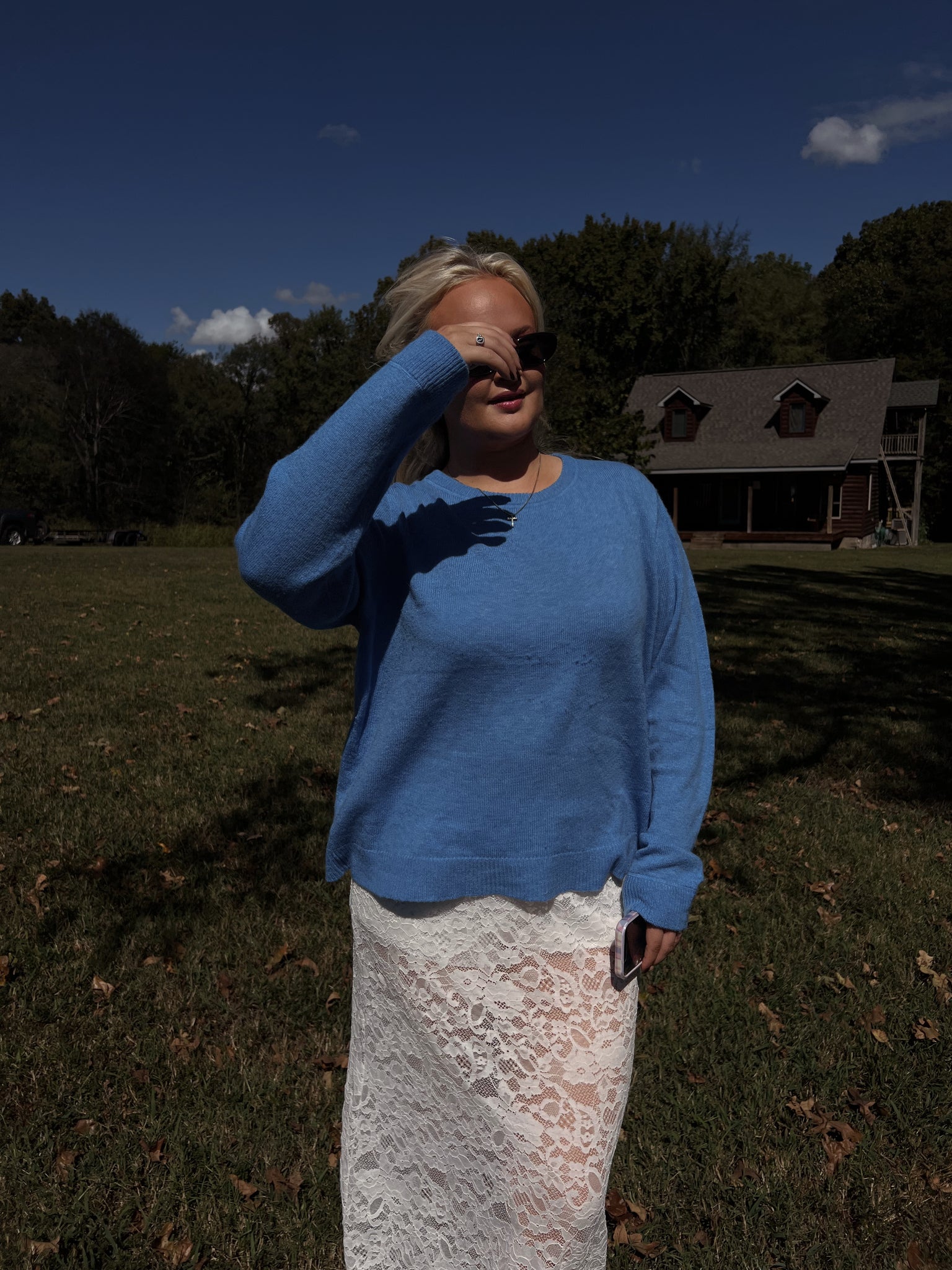 Experience year-round comfort with the Ocean Blue Oversized Sweater. Crafted from super soft material, it offers a cozy, slightly oversized fit that's perfect for layering. The vibrant ocean blue adds a fresh, stylish pop of color to your fall wardrobe and beyond, making it an essential piece you'll reach for time and again. Runs true to size.