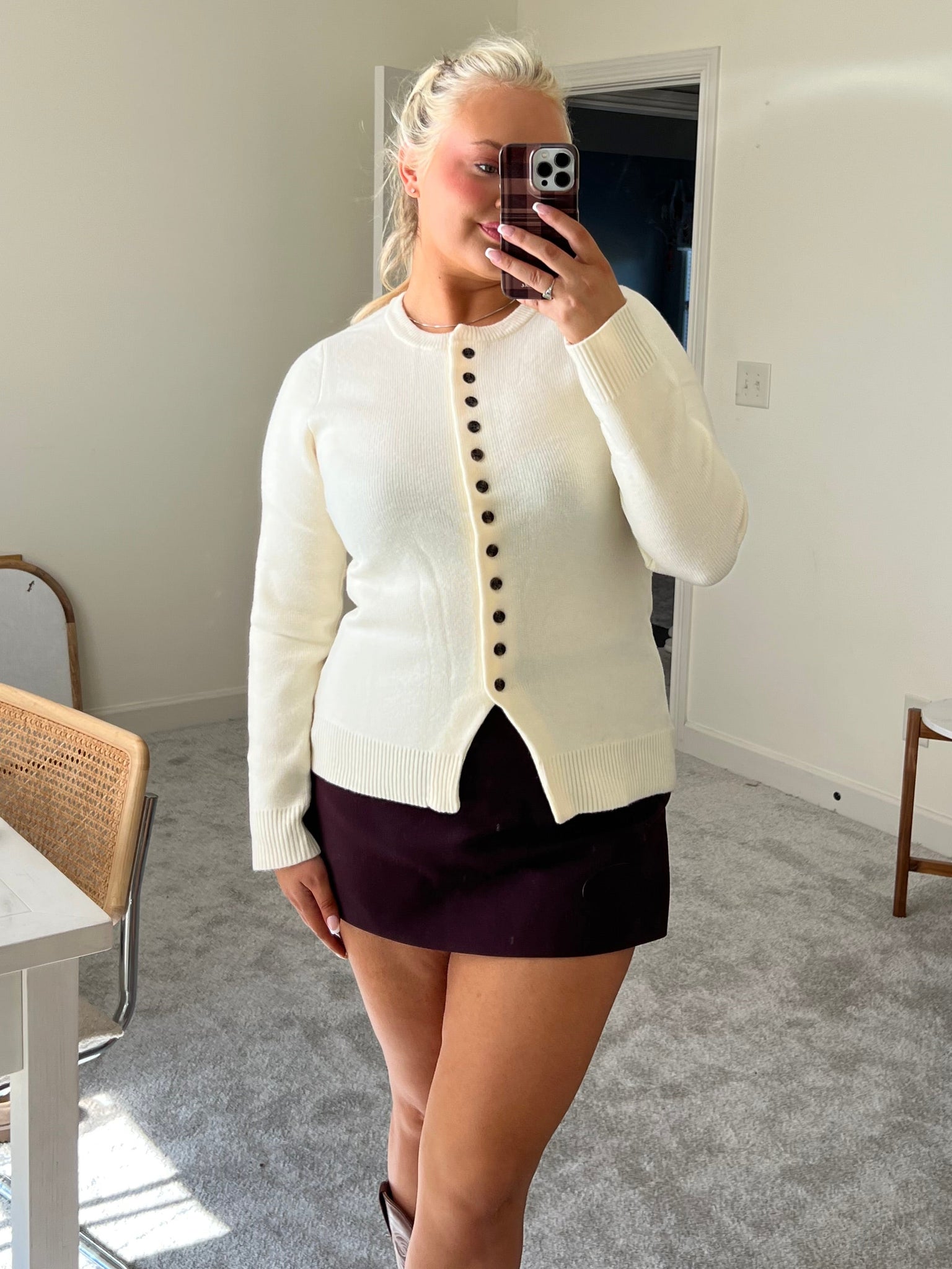 Elevate your wardrobe with this stunning cream cardigan designed to flatter your silhouette. The cinched waist creates beautiful definition while the full button-down front offers effortless styling versatility. Layer it over your favorite pieces or wear it as a statement piece—this cardigan pairs beautifully with our brown adjustable waist midi skirt for a polished, put-together look that celebrates your curves. Runs true to size.