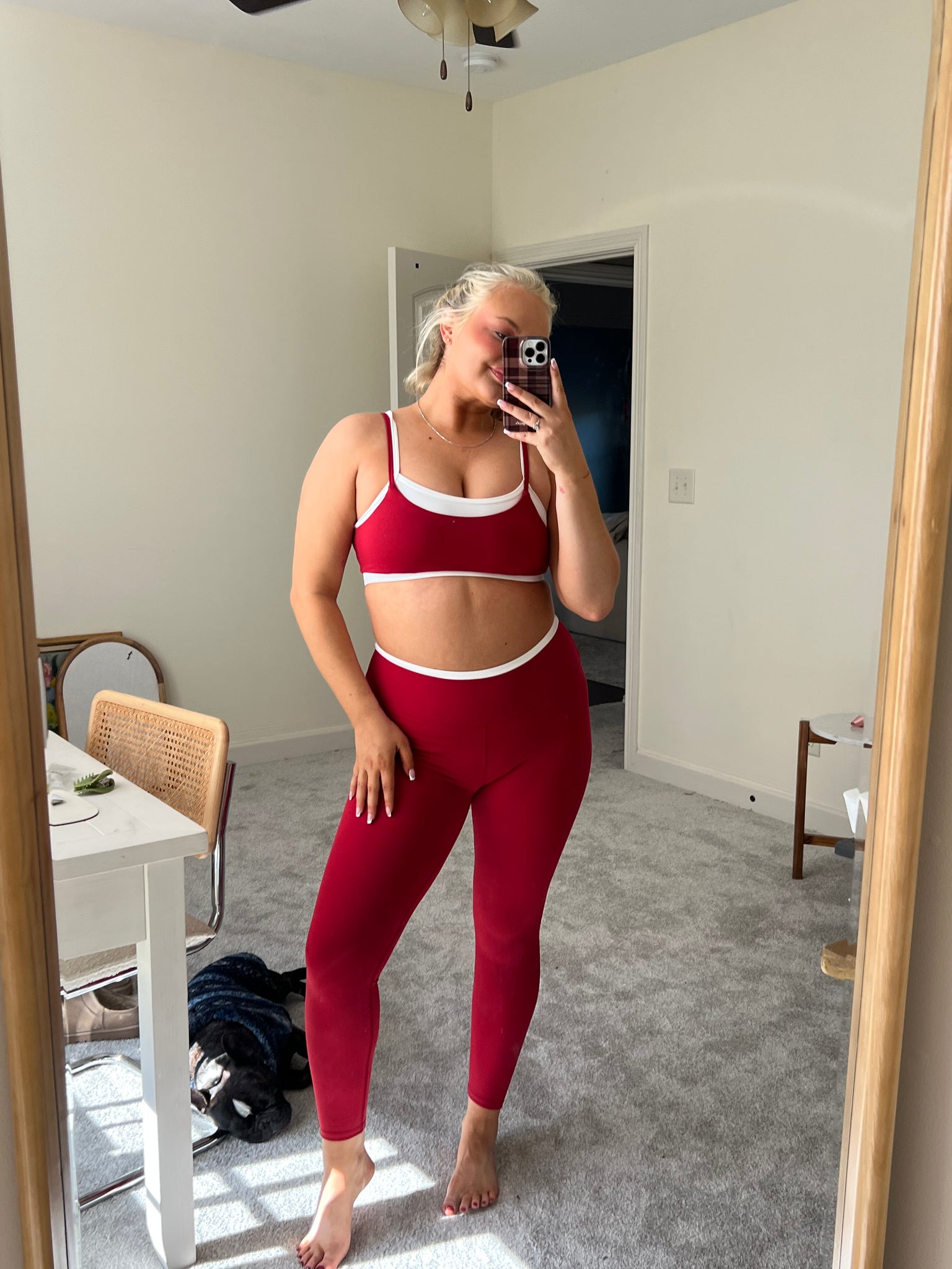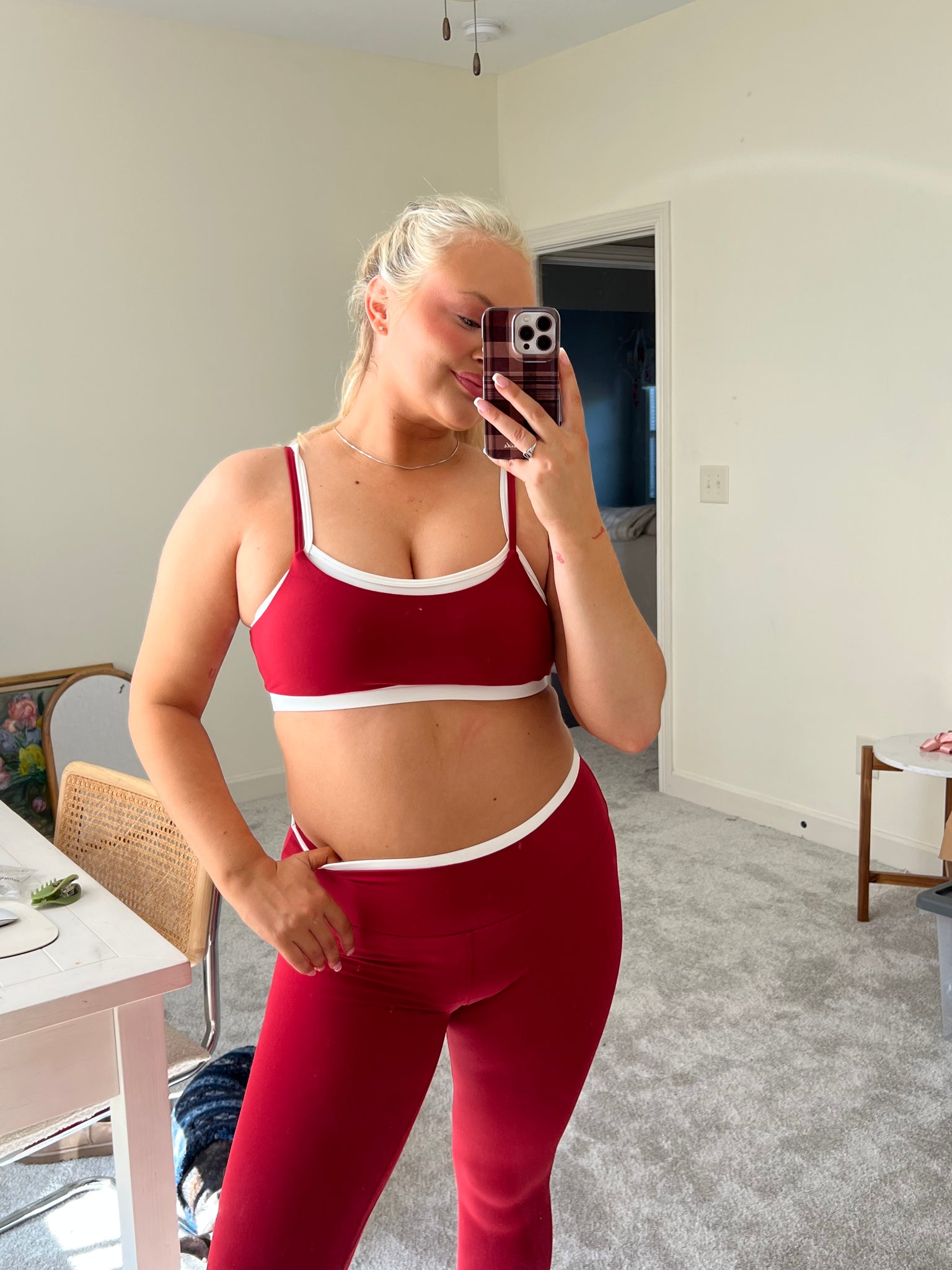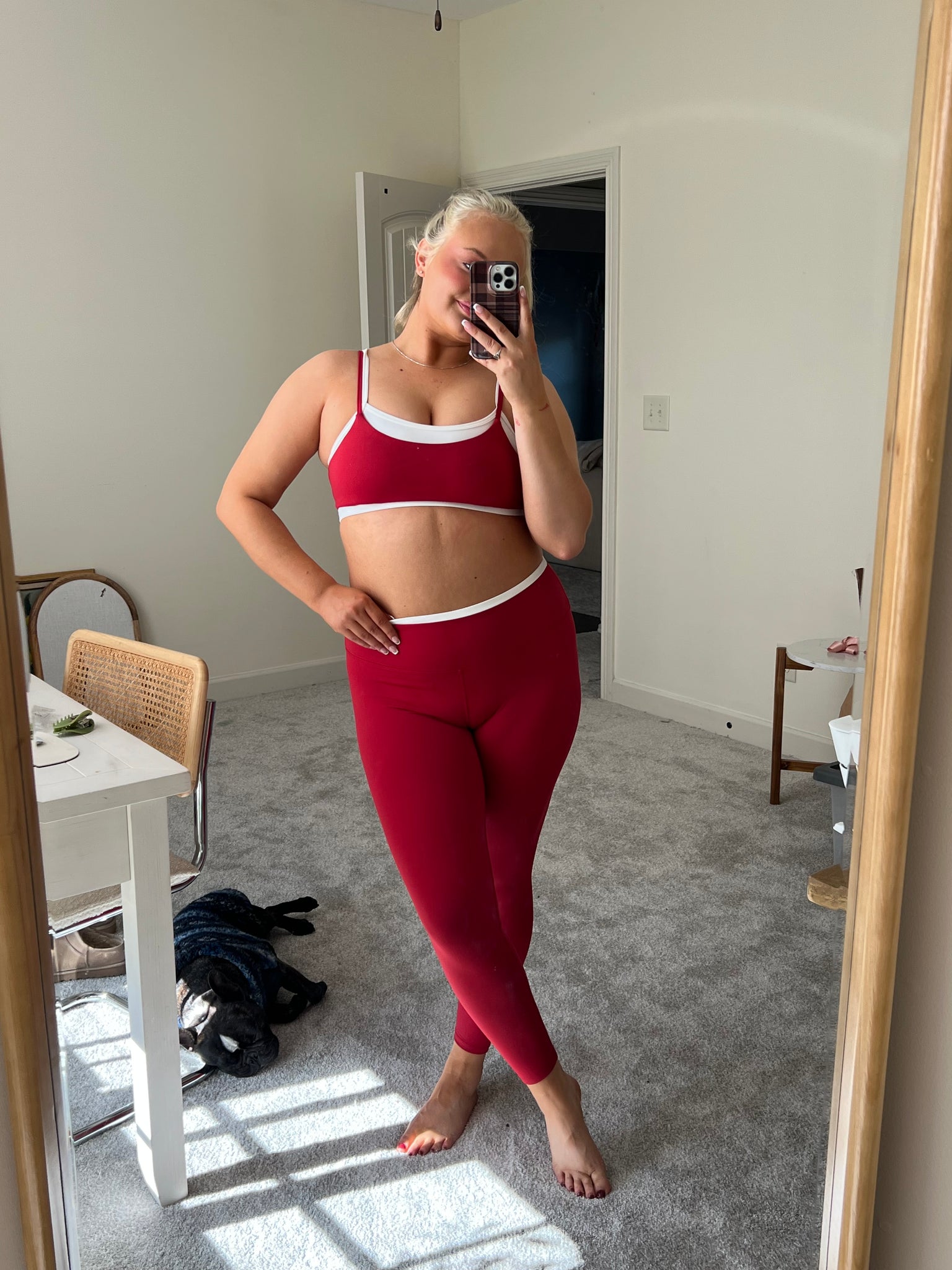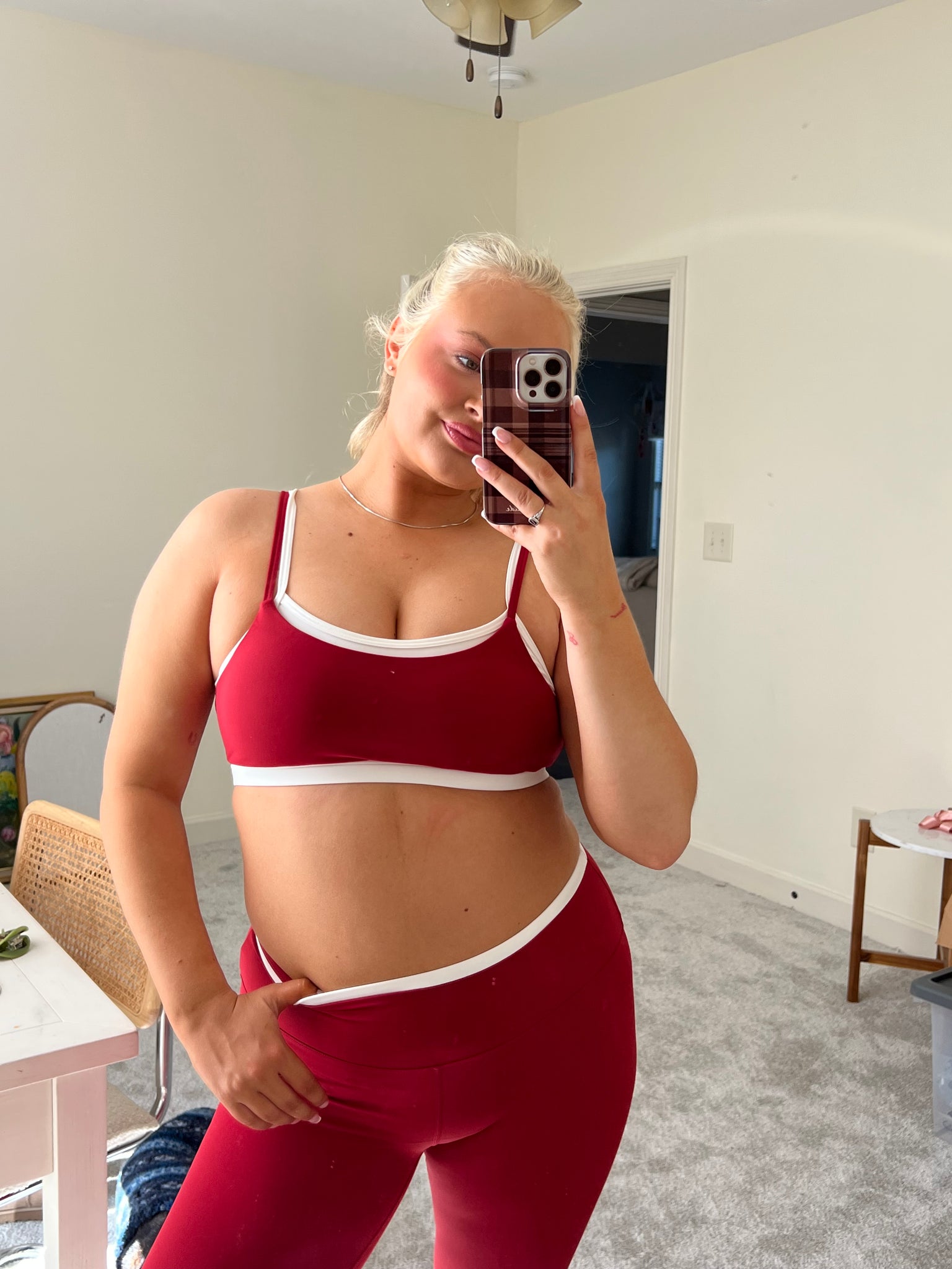 Meet your new go-to athletic essential. This cherry-colored matching set pairs a supportive sports bra with sleek leggings, both crafted with the same quality you love from our bestselling teddy active set. Adjustable straps customize your fit, while the flattering design works as hard as you do—whether you're crushing workouts or tackling your daily to-do list. Trendy, comfortable, and undeniably cute, this set proves you don't have to choose between style and performance. Runs true to size, Rylee wears a size Large.