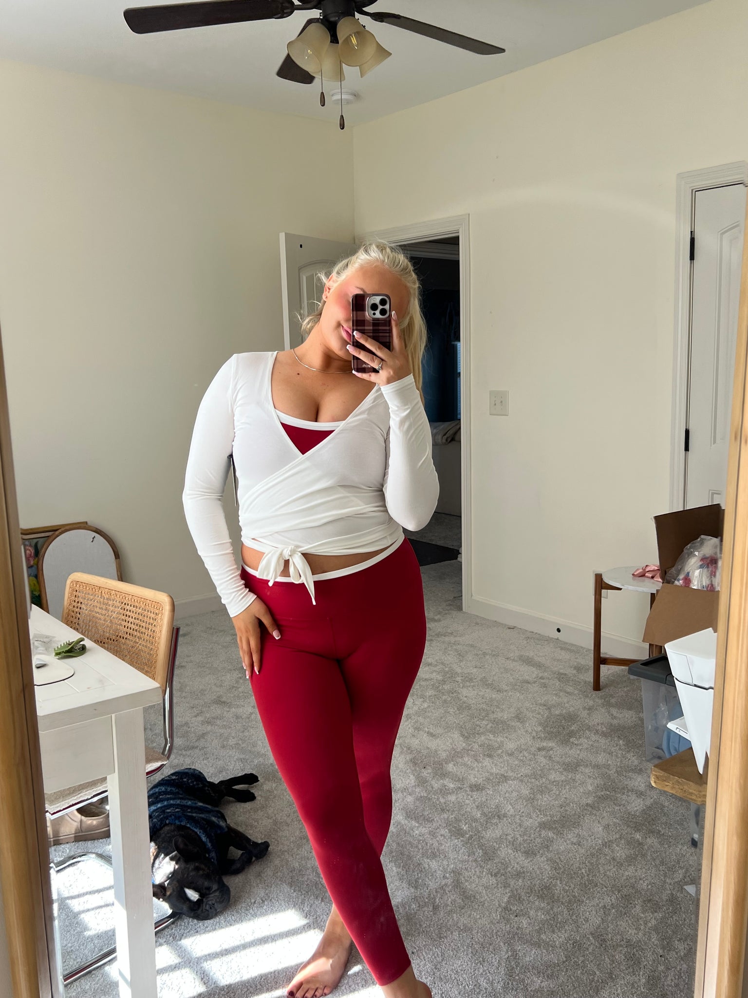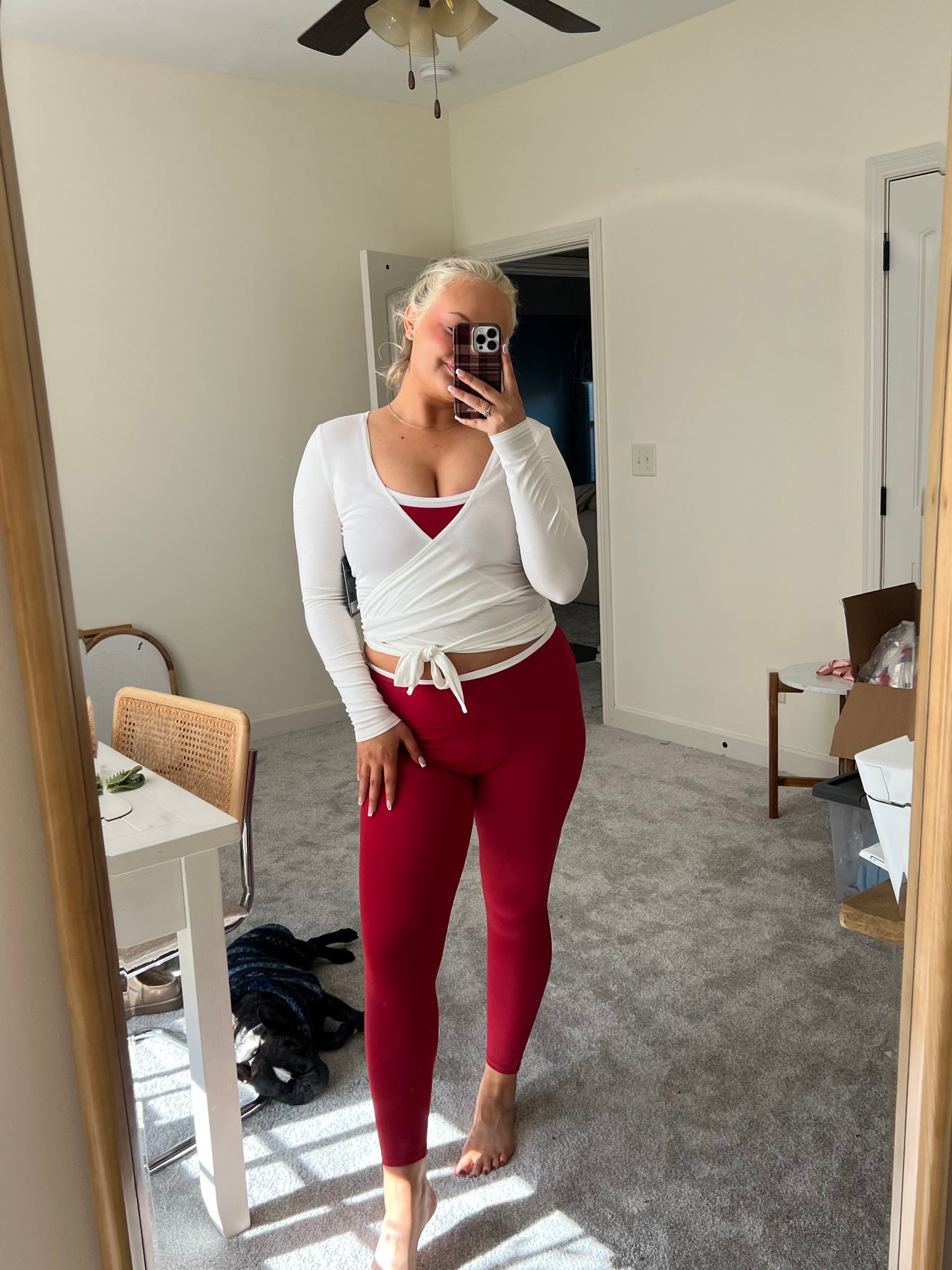 Elevate your gym aesthetic with this versatile white athletic wrap top—the perfect layering piece to wear over your sports bra. Designed with a slightly sheer fabric that adds dimension to your workout look, this top combines style with functionality. The wrap silhouette flatters your frame while allowing unrestricted movement during intense training sessions. Runs true to size for a confident fit every time. Transform your fitness wardrobe with an essential piece that takes your workout style from basic to bold.